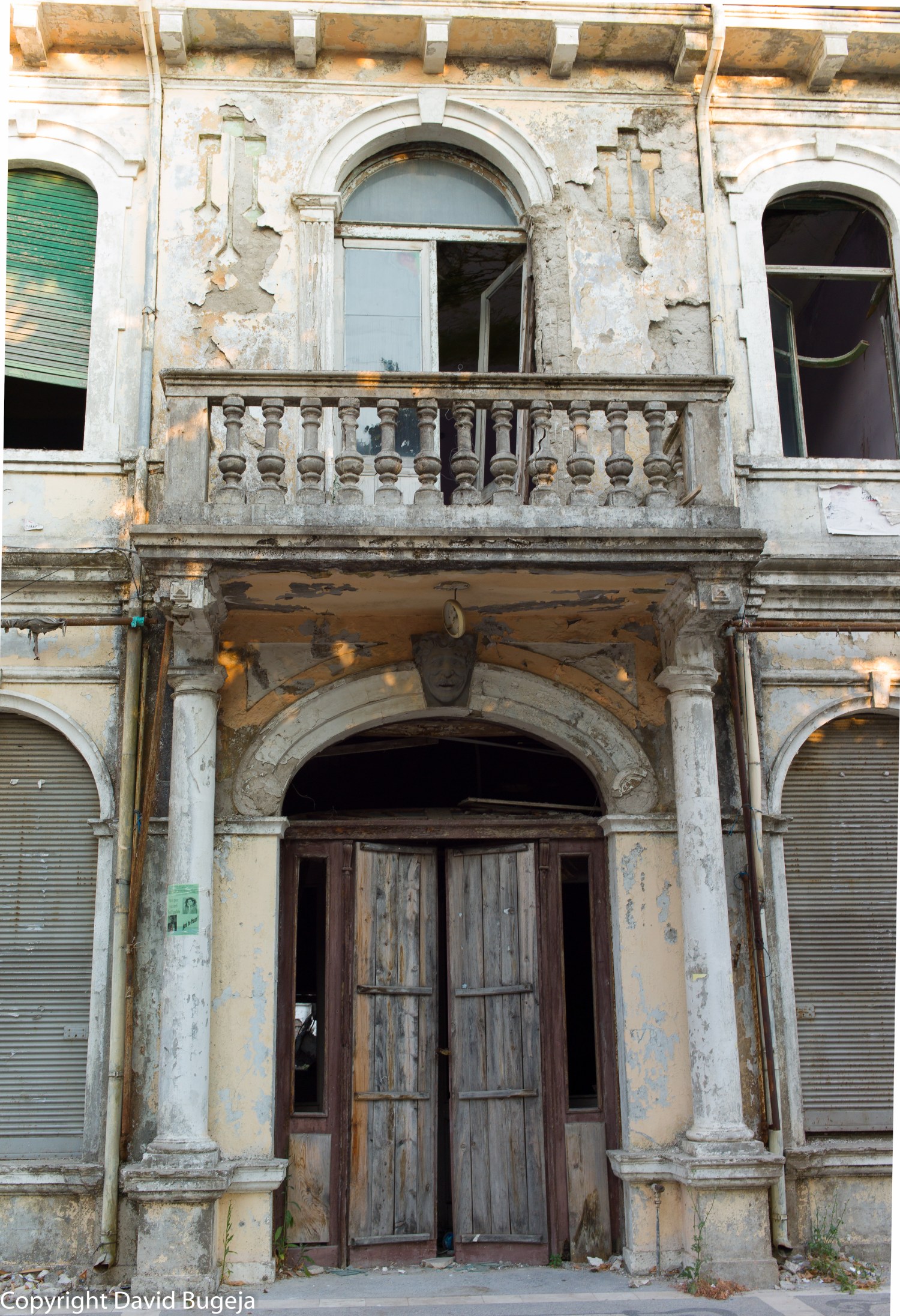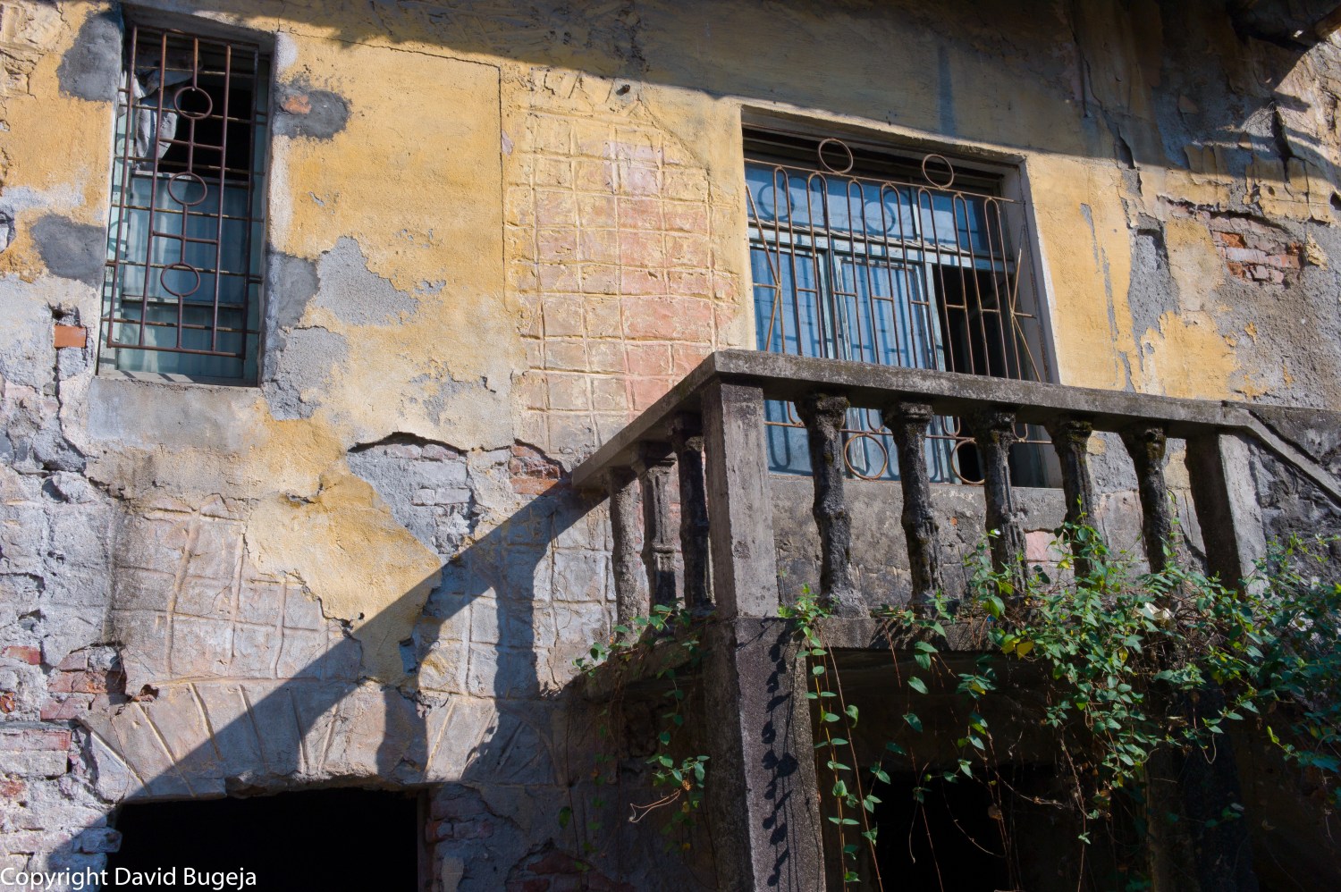 I was fascinated by the play of golden evening sunlight reflected off stone and plaster beneath the open balconies of this derelict building. And what about the interior detail of the crumbling, corroded iron mesh holding up the roof from caving in and visible through the wide ajar door right above the balustraded balcony?